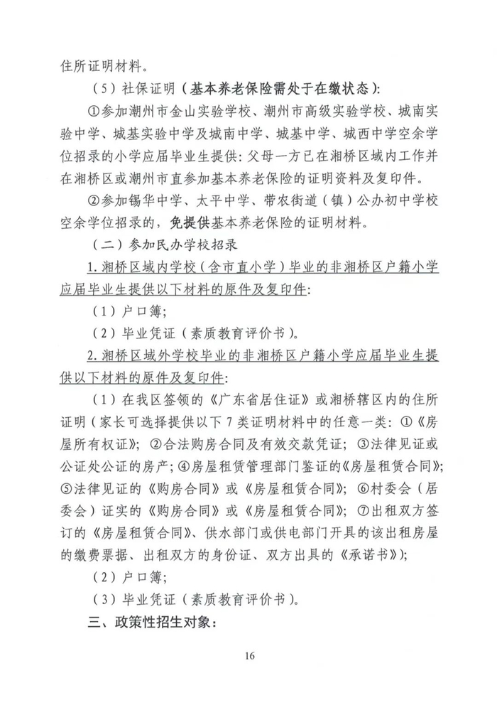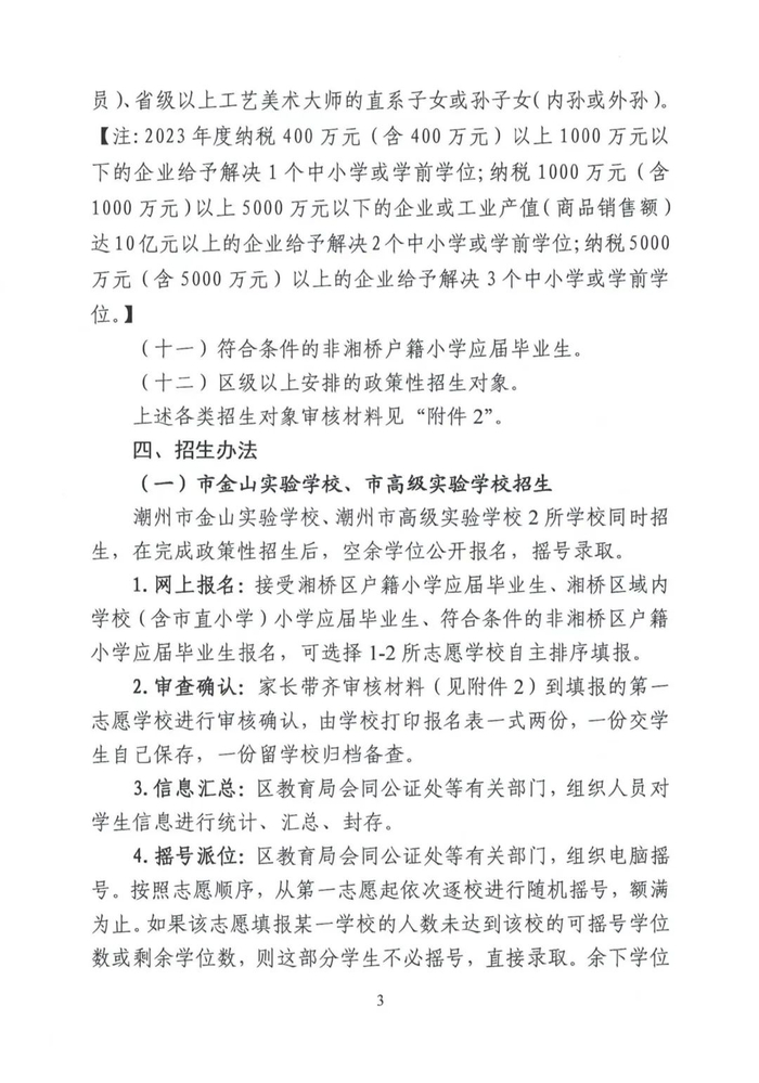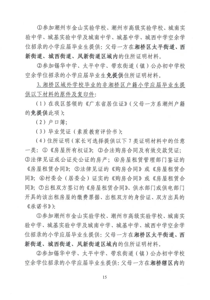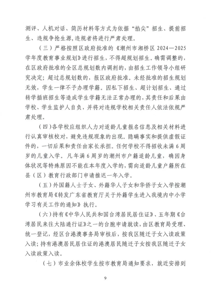 湘桥区2024-2025学年度初中一年级招生工作意见