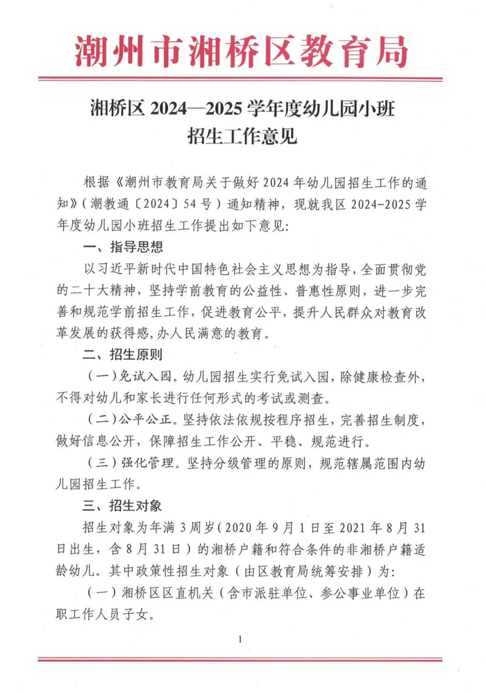 湘桥区2024-2025学年度幼儿园小班招生工作意见