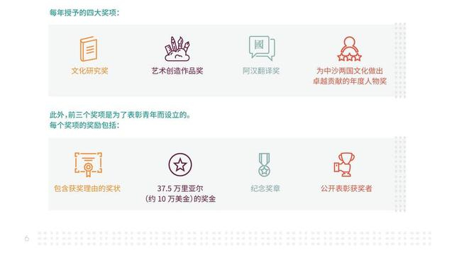 “中沙文化合作奖”每年授予的四大奖项包括文化研究奖、艺术创造作品奖、阿汉翻译奖以及为中沙两国文化做出卓越贡献的年度人物奖。其中,前三个奖项专为表彰青年而设立,可由个人提交提名。
