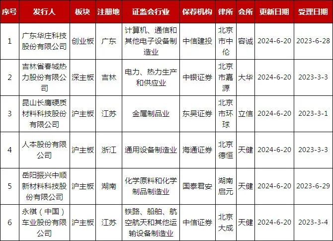 华庄科技经过2轮问询,截止终止前第2轮问询未回复;春城热力,交易所已发出第1轮审核问询函,截止终止未回复;长鹰硬科进行了1轮问询与回复;人本股份进行了1轮问询与回复;中顺新科对首轮问询未回复;永祺车业进行了1轮问询与回复。