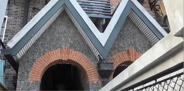 南侧三角造型联立入户门头颇有特色,外墙为黑灰色干粘石,半圆形入口门洞,门洞上方清水红砖圆拱造型,内侧水磨石楼梯直通二层,门头顶部双坡平瓦屋面,两个门头屋面交接之处有白铁落水斗将积水排至明沟。按照设计要求,原墙面干粘石粉刷层空鼓风化情况严重,且原干粘石缺损量较大,通过局部修缮方式无法满足整体观感的要求,故对门头的面层采取凿除新做,将相邻门头之间的落水管隐藏于封檐板之后,优化入口立面风貌。