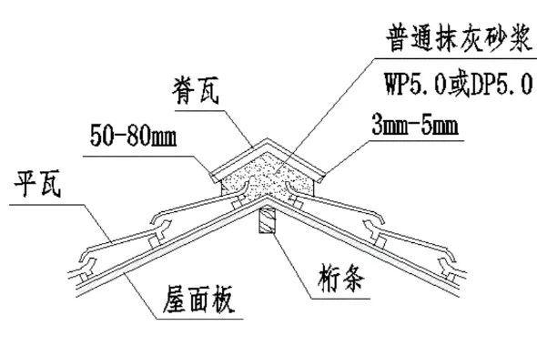 脊瓦铺设:屋脊要做到窝缝密实、光洁、平直、和顺、两头不超高,脊瓦下口高度不得超过80mm,屋脊上口收进3mm~5mm。
