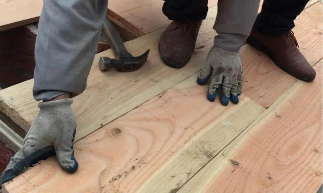 新铺防水卷材:拆除老旧油毛毡,防水卷材铺设顺序应由下往上、从左至右,短边搭接长度≥150mm,长边搭接长度≥80mm,如遇斜沟处,卷材铺设应过斜沟中心线。防水卷材铺贴应超过檐口50mm以上,然后,在卷材面依次钉上顺水条,顺水条间距不超过500mm。