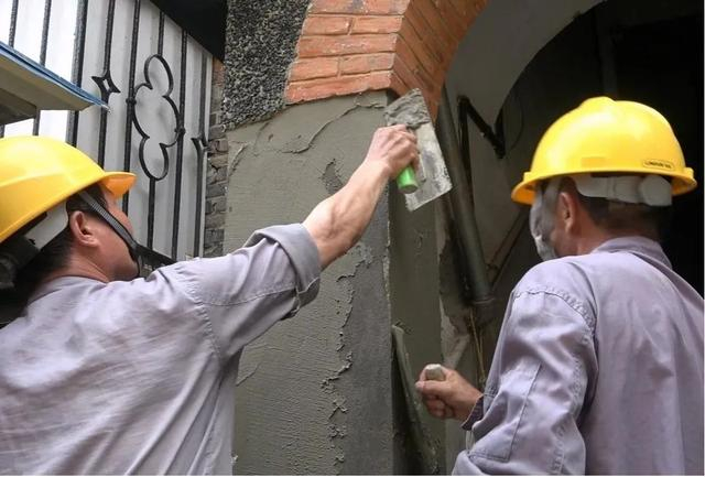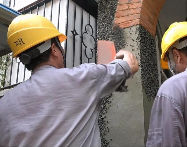 基层处理:通过手持电动机械结合人工,凿除墙面干粘石粉刷层至结构层(砖面)并将墙面清扫干净,突出墙面的砂浆层剔去,浇水湿润墙面。
