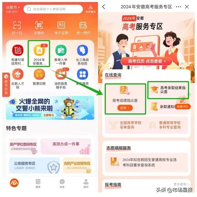 在皖事通APP内找到并进入“2024年安徽高考服务专区”,点击“高考成绩指尖查”或“高考录取结果指尖查”服务,输入考生相关信息即可查询。