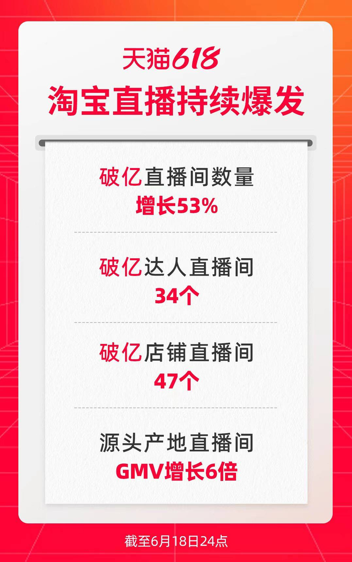 淘宝直播破亿直播间数同比去年增长53%,其中产生了34个破亿的达人直播间,47个破亿店铺直播间。在食品生鲜行业,直播成为新的增长极。截至6月17日,天猫食品生鲜行业直播销售额增速高达261%。店播加速爆发,有47个店铺直播间成交额破亿。“像经营店铺一样经营直播”,今年618品牌和商家都加大了对直播的投入。