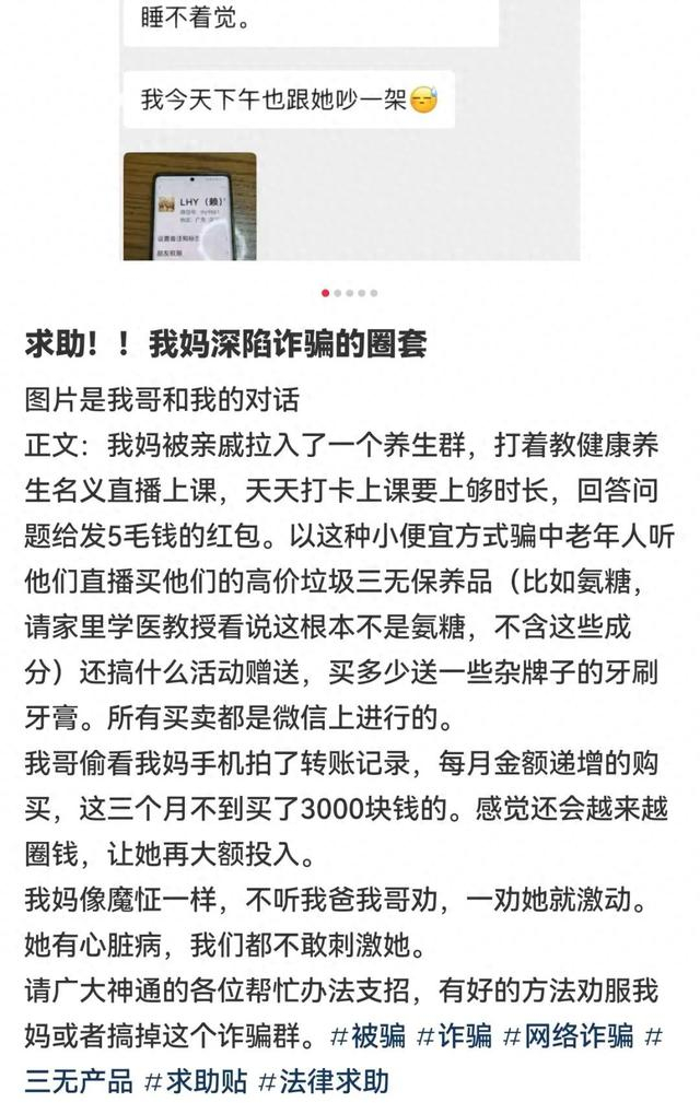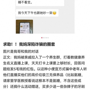 这不是个例,不少网友也在社交平台上分享出家中老人的类似遭遇。有网友说,自己的母亲被亲戚拉入了一个养生群,打着教健康养生名义直播上课,天天要上够时长,直播间还高价售卖三无保养品,其母亲3个月不到花了3000块钱,像魔怔一样不听劝……