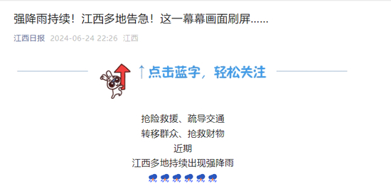 据央视新闻,根据《江西省防汛抗旱应急预案》规定,鉴于当前防汛形势,经江西省防指总指挥同意,江西省防指决定自6月24日20时起,将防汛四级应急响应提升至三级应急响应。各地各部门按照职责分工和预案规定,积极做好防汛工作。