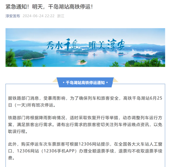 受暴雨影响,2024年6月25日高铁桐庐站、桐庐东站所有列车停运,杭州西站部分区段旅客列车停运,此前高铁千岛湖站也宣布当日停运!
