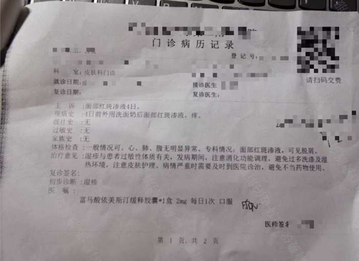李女士遵循商家要求,前往当地三甲医院皮肤科进行面诊,医生确认其患有护肤品过敏皮疹,并开具了相关医院证明并加盖医院章。