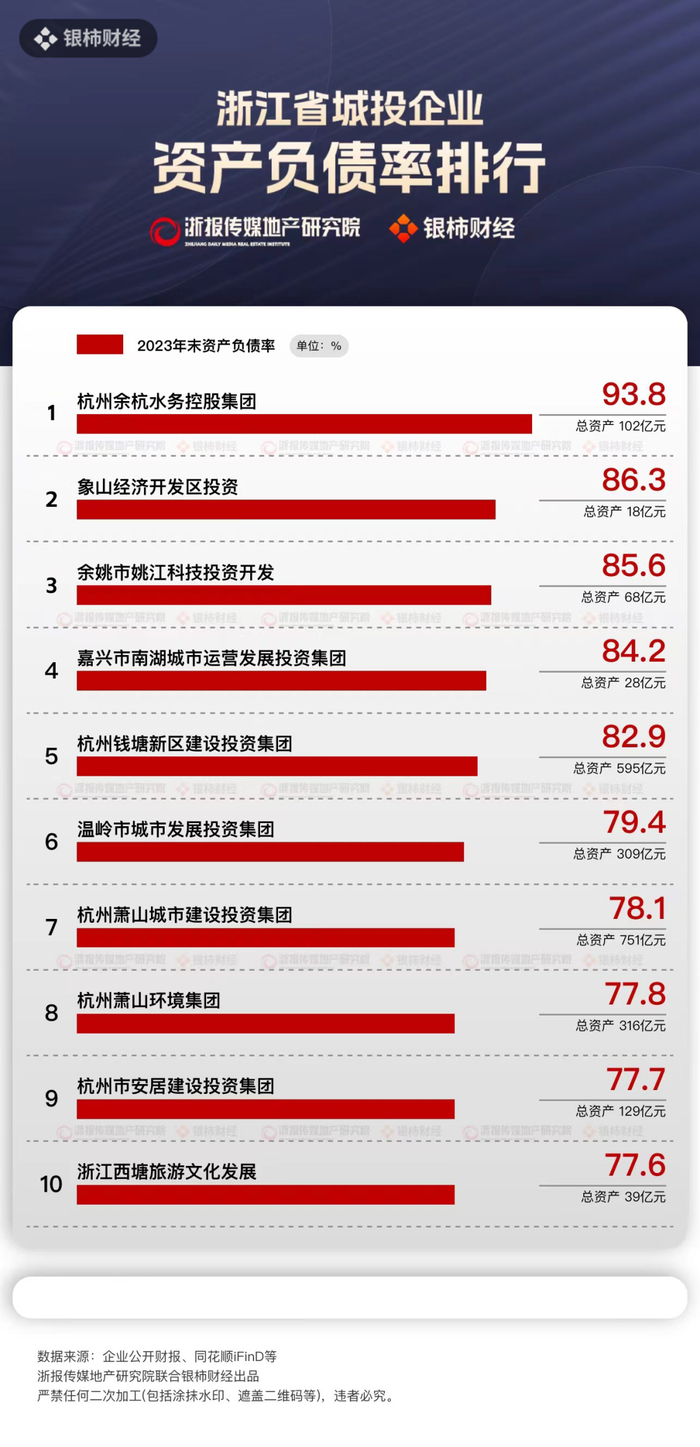 银柿财经梳理后发现,资产负债率较高的企业多为资产规模较小的区县级平台。其中杭州余杭水务控股集团有限公司的资产负债率最高,达到93.77%,且该公司已连续4年亏损,亏损额从2022年的1.6亿元扩大至2023年的3.2亿元。象山经济开发区投资有限公司和嘉兴市南湖城市运营发展投资集团有限公司的资产负债率均超过了80%,两家公司在浙江省城投企业的总资产排名中分列倒数第一位和倒数第二位。