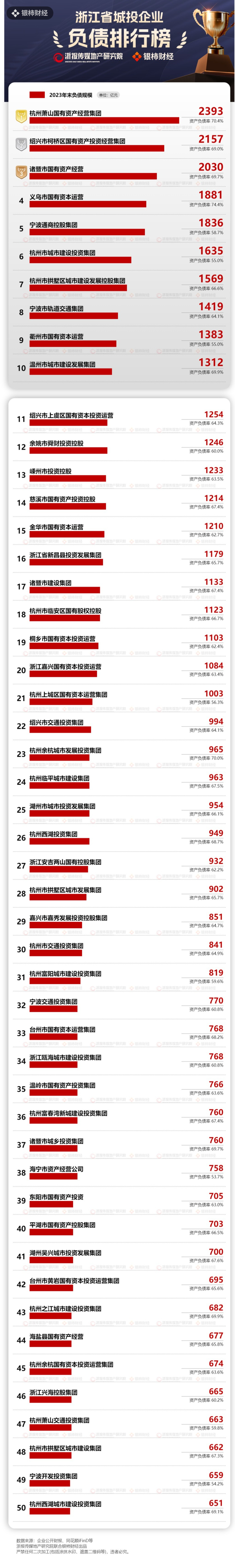 负债规模超过2000亿元的城投有3家,分别是杭州萧山国有资产经营集团有限公司、绍兴市柯桥区国有资产投资经营集团有限公司和诸暨市国有资产经营有限公司。值得一提的是,3家资产负债率均在70%左右,明显高于浙江城投的平均水平。
