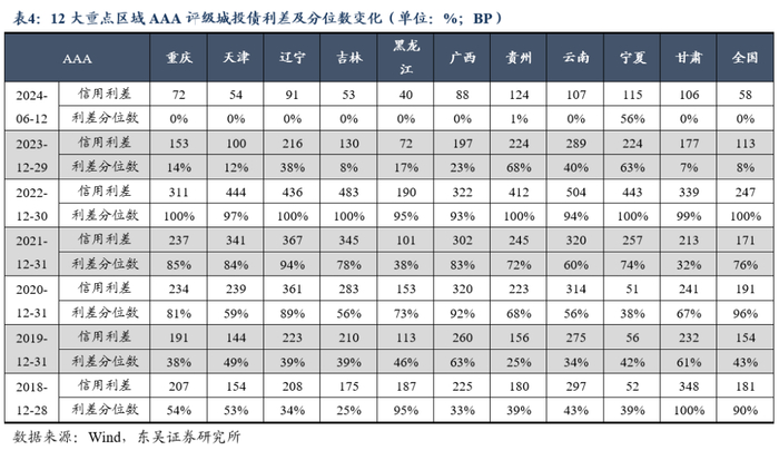 3)重庆与其余11个高债务负担的区域均面临城投利差极致压缩的现状,仅个别区域尚有一定空间,如AAA级中的宁夏,AA+级中的贵州、辽宁、甘肃,AA级中的云南、吉林,因此针对12大重点区域采取下沉策略的性价比或受限,建议仍以久期策略为主,短期内可适度拉长久期至2-3年以取得票息收益。此外,资金利率调整、化债措施落地效果及化债政策变化等因素均有较大概率引起重庆市等重点区域城投债的估值波动,但风险与机会同在,倘若区域顺利退出高风险重点省份之列并得以重启新增融资,则可受益于金融资源再分配趋势,突破融资掣肘、盘活存量资产,故建议关注重庆市“退名单”的政策信号,优先关注区域内未被列入“借新还旧”名单的主体、转型进程顺利的主体及产业投资型、金融控股型主体。