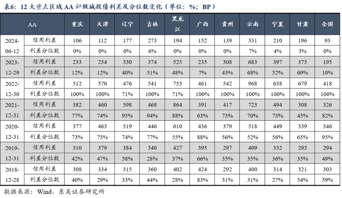 截至2024年6月12日,目前重庆市AAA及AA+级城投债利差水平接近且出现小幅倒挂,AA级利差在2023年下半年期间显著收窄并向区域内高评级债券靠拢,估值抬升较多故收益风险性价比有所减少,AA-级利差虽然同样显著收窄,但其利差水平仍明显高于中高评级债券,表明投资者对于进一步下沉仍持谨慎态度,或系城投债主要配置力量中的公募基金、理财子公司等机构投资者对持仓债券流动性要求较高所致。