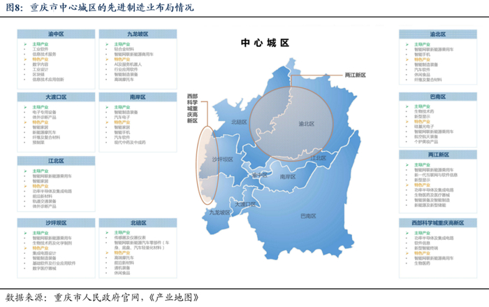 因此,在2027年即重庆市直辖满30年这一时点之前,重庆市人民政府发布了《重庆市先进制造业发展产业地图(2023年)》(以下简称《产业地图》),提出重庆市将着力打造“33618”现代制造业集群体系,迭代升级制造业产业结构,全力打造国家重要先进制造中心。具体而言,2个“3”分别指智能网联新能源汽车、新一代电子信息制造业、先进材料3大万亿级产业集群和智能装备及智能制造、食品及农产品加工、软件信息服务3大五千亿级支柱产业集群,“6”是指包括新型显示、高端摩托车、轻合金材料、轻纺、生物医药、新能源及新型储能在内的6大千亿级特色优势产业集群,“18”是指包括卫星互联网、生物制造、生命科学、元宇宙等6个未来产业集群和包括功率半体及集成电路、AI及机器人、服务器、智能家居等12个高成长性产业集群。
