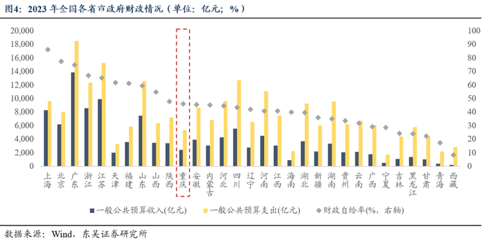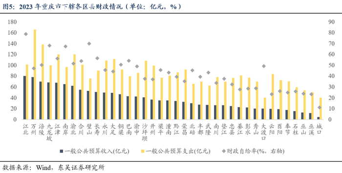 分区域看,重庆市下辖26个区、8个县和4个自治县,下辖各区域的财政自给能力总体不强,主城九区(包括渝中区、大渡口区、江北区、沙坪坝区、九龙坡区、南岸区、北碚区、渝北区、巴南区)整体财政收支规模仍具有领先优势。具体而言,财政收入数量方面,江北区、万州区、涪陵区的收入表现情况较好,2023年一般公共预算收入均在70亿元以上,其中江北区的预算收入更是突破80亿元;而巫山区、巫溪区和城口区2023年一般公共预算收入位列全市最末,分别为13.03亿元、11.77亿元和4.50亿元,远低于中位数34.83亿元。财政收入质量方面,江北区、璧山区、九龙坡和南岸区收支平衡情况较好,财政自给率分别为78.83%、70.17%、68.27%和67.48%。