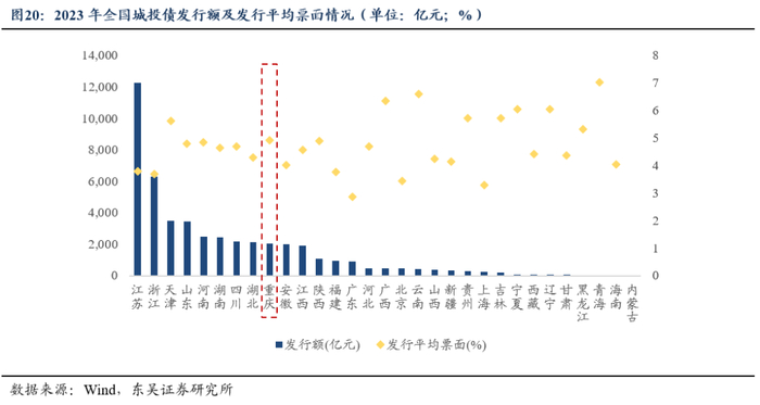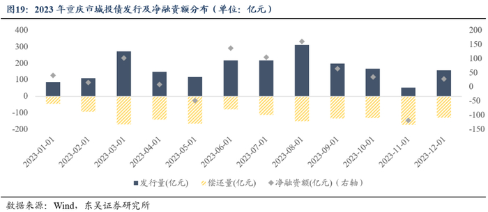1)重庆2023年共发行城投债2,049.25亿元,较大的发行规模或主要源于债券集中到达兑付和回售期以及债市无风险利率处于下行通道。