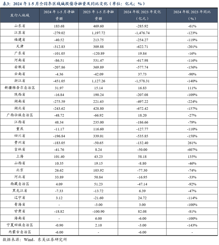 2)2024年融资节奏受“一揽子化债方案”的推进而变化,2024年1-5月包括重庆在内的全国各区域城投净融资以负值居多且同比显著缩量,严监管颇见成效。