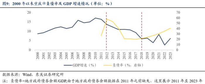 在2012年之前,“八大投”的债务快速扩张,带动重庆市的负债率持续攀升并于2012年达到峰值,而与债务增长相伴的是投资扩张和经济增长,2012年以前各年度GDP均保持双位数高增,2012年当年GDP同比增速达13.60%。2012年之后,重庆市面临经济转型的压力,政府加杠杆的速度明显放缓,在2013年至2018年之前,负债率明显下降,从2012年高峰的57.74%大幅下降至2017年的20.03%,“八大投”在此期间的积极整合和转型也为当地负债率的降低作出贡献。