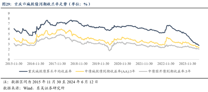 在到期收益率表现方面,为估计重庆市城投债的到期收益率,我们根据Wind概念板块城投债口径,对2015年11月30日至2024年 6月12日期间重庆市存量城投债个券的中债估值收益率进行算术平均,并基于重庆市发债城投数量以AA级居多且剩余期限结构以中短期限为主的特征,选择3年期AA级中债城投债到期收益率及3年期国开债收益率作为参照基准利率,与重庆市存量城投债到期收益率走势进行对比。