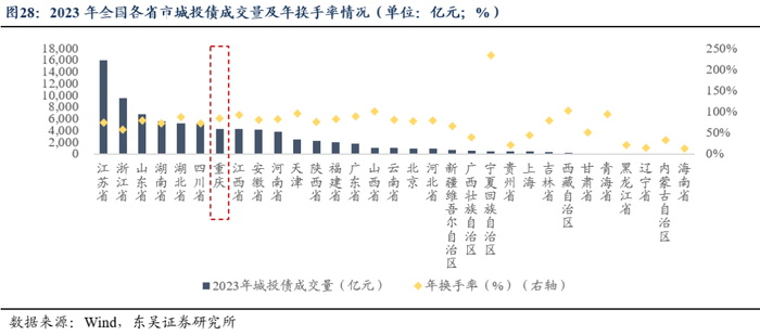 1)2023年成交量4286.52亿元,年换手率83.08%,市场热度较高或主要由于重庆存量规模较大且高债务率转化为可观的收益率。