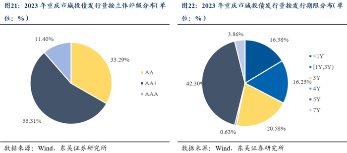 3)2023年重庆城投债平均票面利率为4.92%,在利率下行的驱动下较往年已有所下降,但与其他区域横向对比仍存在风险溢价,未来各类化债措施或可能进一步压降融资成本。