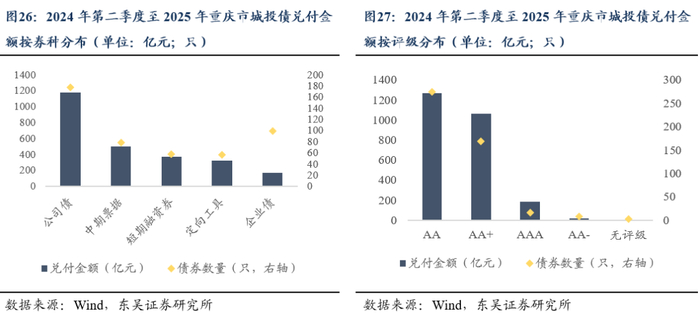 2024H2-2025年期间再融资节奏整体均衡,公司债兑付金额最大,企业债兑付金额较少但债券数量较多表明重庆城投将兑付的个券平均本金较低,兑付压力有限、偿债风险分散;AA级主体兑付金额最高而AAA较小表明高评级主体违约风险有限,适宜向久期要收益。