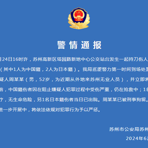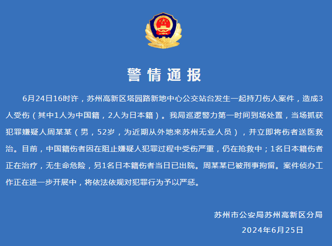 据苏州高新公安微警务消息,6月24日16时许,苏州高新区塔园路新地中心公交站台发生一起持刀伤人案件,造成3人受伤(其中1人为中国籍,2人为日本籍)。该局巡逻警力第一时间到场处置,当场抓获犯罪嫌疑人周某某(男,52岁,为近期从外地来苏州无业人员),并立即将伤者送医救治。目前,中国籍伤者因在阻止嫌疑人犯罪过程中受伤严重,仍在抢救中;1名日本籍伤者正在治疗,无生命危险,另1名日本籍伤者当日已出院。周某某已被刑事拘留。案件侦办工作正在进一步开展中,将依法依规对犯罪行为予以严惩。