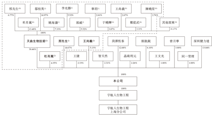 * 天曲生物技术的股东:以邢国良先生意见为准的一致行动股东包括邢国良先生(6.67%)、邸桂英女士(14.97%)、杜肖岚先生(13.48%)、姚海涛先生(7.33%)、李光胜先生(5.52%)、郭威先生(5.52%)、于晓辉先生(3.87%)、郑从武先生(3.33%)、陈晓星先生(2.76%)、王尚义先生(2.67%)、华玥女士(2.61%);其他39名股东持股31.17%,包括杨建标(3.68%)、安堃(2.99%)、奇达拉(1.88%)、王然颖(1.56%)、刘利成(1.47%)、王亚男(1.47%)、李长春(1.44%)、邢国芳(1.20%)、宋晓峰(0.98%)、武剑虹(0.93%)、邢国慧(0.90%)、唐洪光(0.79%)以及其他27名个人股东。