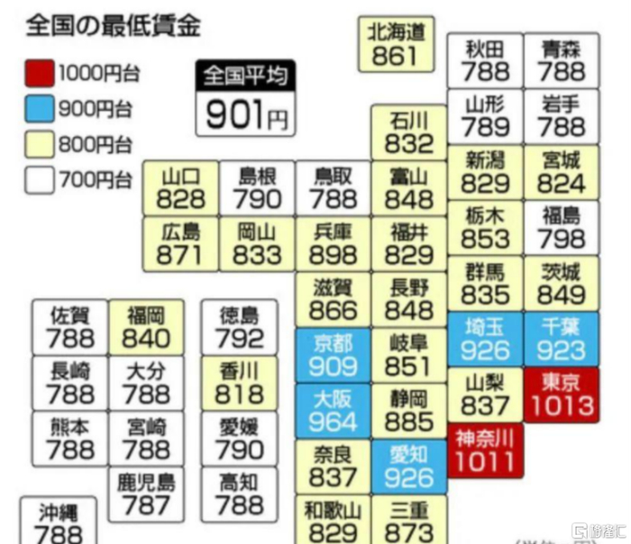 按照日本各地政府公布的最低时薪标准,人口集中地区的收入水平明显更高。