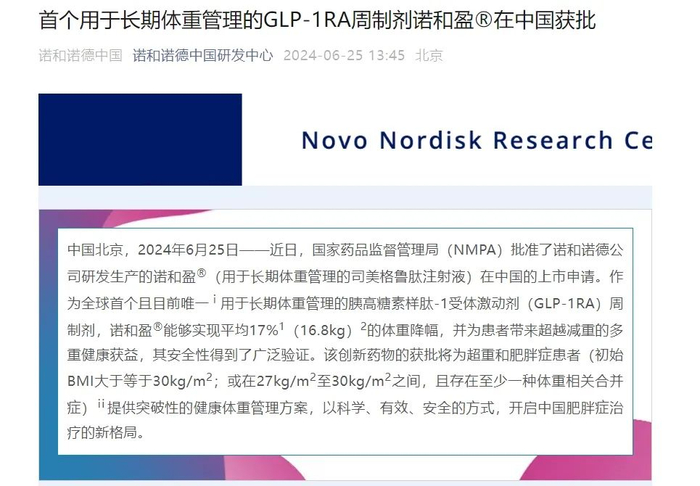今日,诺和诺德对外宣布,国家药品监督管理局(NMPA)已于近日批准了其研发生产的“用于长期体重管理的司美格鲁肽注射液”(商品名:诺和盈)的上市申请。