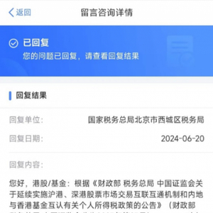 平台回应显示,对于内地个人投资者通过沪港通、深港通投资香港联交所上市股票及买卖香港基金份额取得的转让差价所得,目前继续暂免征收个人所得税。