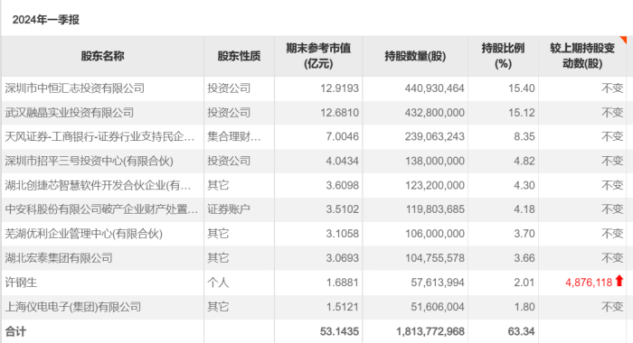 与2022年末相比,截至2024年一季度末,武汉融晶依旧持有4.33亿股,按照1.5元受让价格和当前收盘价2.34元/股计算,武汉融晶账面浮盈为56%,账面浮盈约3.64亿元。