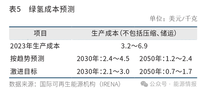 快速发展的可再生氢源为电制甲醇降本奠定了基础。绿氢正逐步发展成为确定性的主流制氢路径。电解水制氢年产量预计将由2021年的4万吨(约占氢气总产量的0.04%)指数级提升至2030年的6170万吨(占比约为34%);风能、太阳能等可再生电力成本已具备一定竞争优势,且未来仍有较大挖掘潜力;电解槽技术创新带来的利用效率逐步提升、规模经济效应等也有助于降低绿氢成本。总体看,未来丰富而廉价的可再生氢源是绿色甲醇降本的主要驱动力。绿氢未来成本预测见表5。