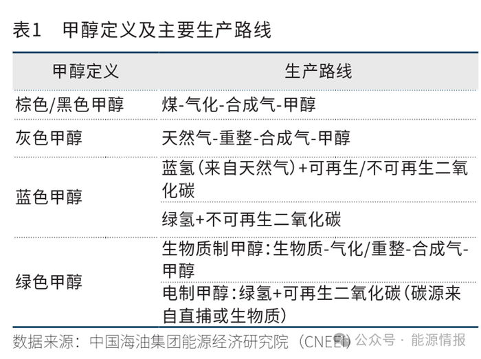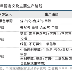 目前国际上对绿色甲醇并没有统一的标准定义,普遍的观点是甲醇的“绿色”与否关键取决于其制取原材料的属性。2021年,欧盟率先发布了全球首个绿色甲醇认证标准。该标准相对严苛,认为只有生物质制甲醇、绿氢与可再生二氧化碳制甲醇(电制甲醇)才能被认定为绿色甲醇,同时强调可再生二氧化碳只能来自生物质或直接空气捕集;利用工业排放端捕集的二氧化碳制甲醇不属于绿色范畴。中国目前正在积极探索建立自己的绿色甲醇标准,但尚未形成成熟统一的认证体系。甲醇的定义及主要生产路线见表1。