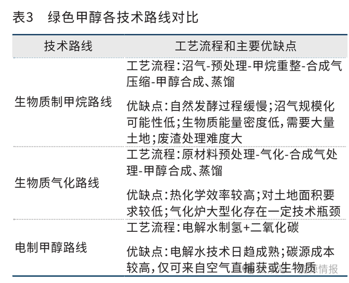 国内外绿色甲醇生产主要有三条技术路线——生物质制甲烷路线、生物气化路线和电制甲醇路线,各技术路线简要对比见表3。受收储半径、商业模式等因素制约,生物质原材料规模化供应不可持续,在绿色甲醇需求量不大的情况下,相比于电制甲醇,生物质制甲烷路线和生物质气化路线成本优势相对明显,产业壁垒相对较低,示范应用相对成熟。电制甲醇中二氧化碳加氢合成工艺十分成熟,综合考虑,随着未来清洁电力成本不断下降、电解水制氢技术和碳源空气直捕复合吸附技术日趋成熟,长期来看,电制甲醇或将成为未来绿色甲醇的主流生产方式。