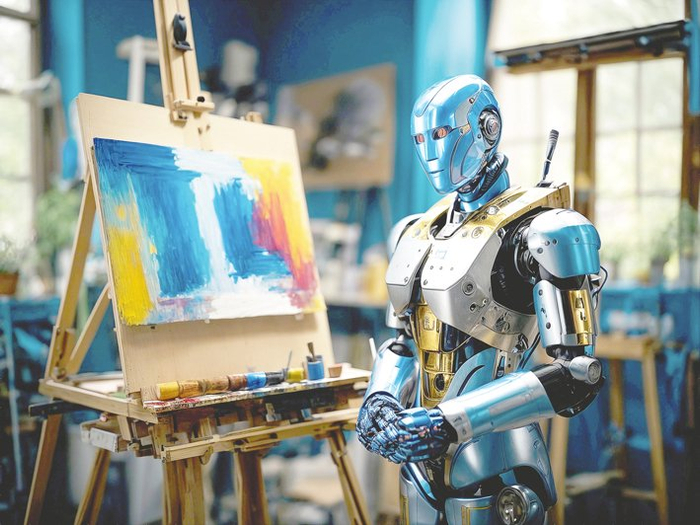 如果说从前还是一道铜墙铁壁,那么现在,虚拟与真实可能仅一线之隔。Sora之后,它的挑战者前赴后继。图为人形机器人拿着画笔站在画架前进行创作,画像由人工智能生成。 视觉中国图