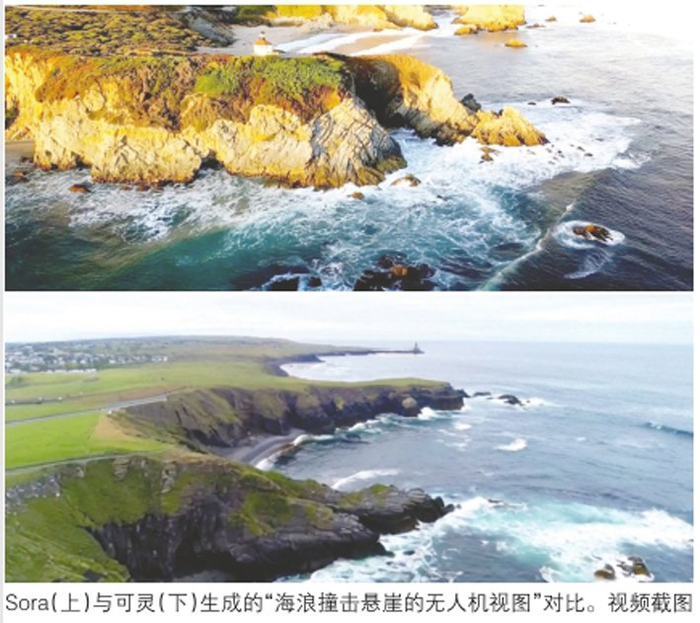 1、动态效果。可灵的“镜头”普遍为前后向逻辑推进,Sora则更丰富。在“海浪撞击悬崖的无人机视图”一项,Sora画面的聚焦点在提示词中“有灯塔的小岛”,对整个环境进行环视,重点突出。可灵的镜头前后推进,小岛被设置在画面的最远端,没有重点突出小岛。不过,Sora和可灵对海浪的运动轨迹描述都很准确。