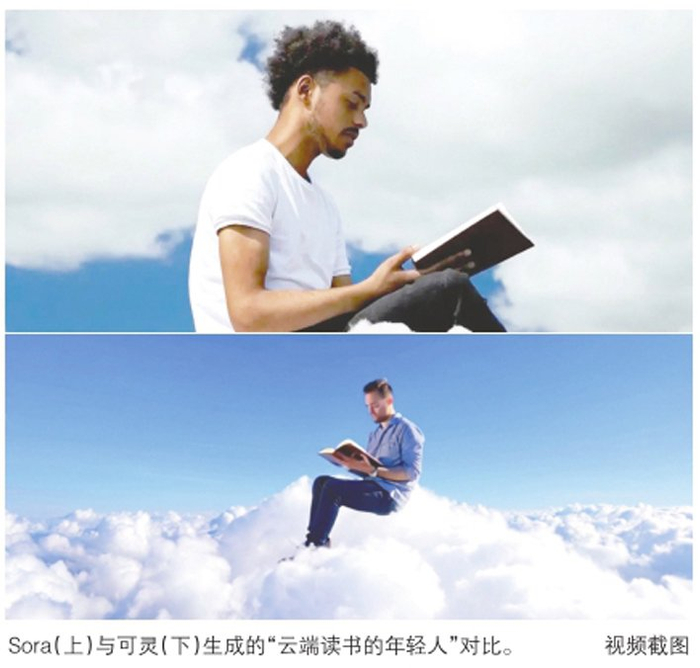 在不同场景的适配上,Sora的能力似乎更胜一筹。在对“云端上读书的年轻人”的画面生成上,可灵的贴图感更重,素材间的融合度不高。在语义的理解上,Sora和可灵都较为准确,特别是对提示词中不同主体的捕捉,都比较完整。