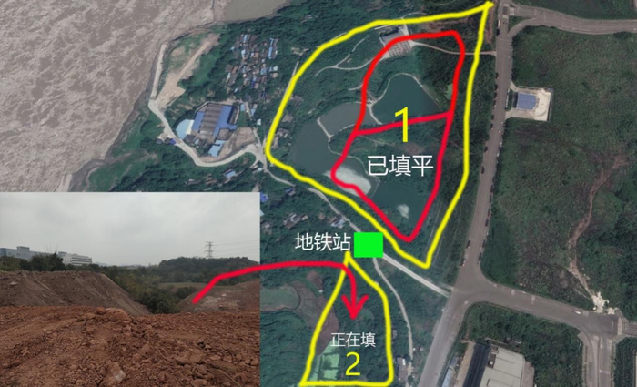 记者实地察看发现,重庆经开区内的南岸区广滨三路佘家岗(卫星图中的1号地块、2号地块),有巨量土石方往地铁站南侧的大致25米至40米深沟推填,原有树木、河沟等被直接填埋。 摄影及制图:程维