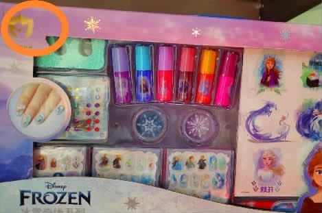 相较于线上,实体门店儿童化妆品销售则规范一些。如,孩子王长沙泊富广场店销售的一款“创意美甲转印贴纸组合”指甲油,产品包装上有明显“小金盾”标识;科建文化用品店所售包含口红、眼影、指甲油等在内的“歌莉儿水晶彩妆箱”,产品包装左上角也有明显“小金盾”标识。