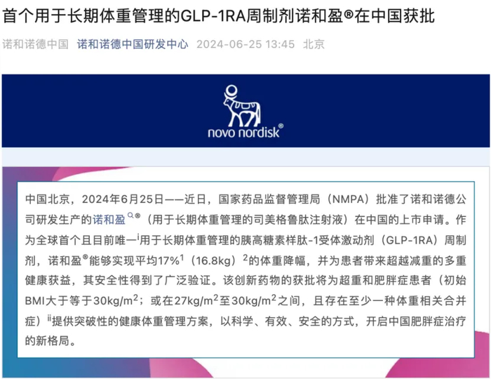 6月25日,诺和诺德宣布,司美格鲁肽用于长期体重管理在中国获批上市。诺和诺德表示,作为全球首个且目前唯一用于长期体重管理的胰高糖素样肽-1受体激动剂(GLP-1RA)周制剂,诺和盈(司美格鲁肽注射液)能够实现平均17%(16.8kg)的体重降幅。