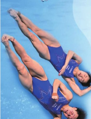 所以,我们仔细看看跳水动作,运动员入水的瞬间,手掌是翻成平面的,在入水的瞬间掌心对准要入水的点,一只手抓着另一只手。这样,手掌形成的横截面与水碰撞,水主要横向运动,因受到四周水的压力无法冲腾而起,这便是掌心向下水花小的原因。当然,压水花不仅仅是手掌需要用力,而是要全身配合。具体要求有手臂贴紧双耳,头、肩膀到脚尖成一条直线,在手掌接触到水面的一瞬间,身体最好是与水面成90度的直线,腰不能松,臀部要夹紧。有时候可以看到运动员入水时出现‘过了’或者‘不够’的现象,入水水花非常大,完成分会被打得很低。造成这样现象的原因不见得就是入水技术没做好,问题往往出现在空中。另外,从10米跳台入水时,瞬间速度可以达到每秒15米,由于入水时身体在空中的旋转很难完全停止,手掌就需要调整方向,而不能只是平行于水面,这样做是为了避免受伤。