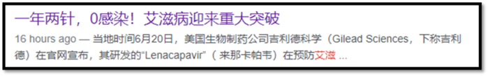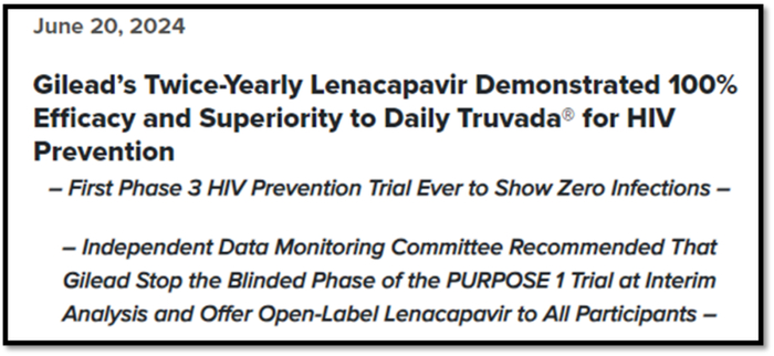 半年注射一针能百分百预防HIV感染,这是人类抗击艾滋病的重大突破。该新闻来源是医药巨头吉列德,它的一个3期临床试验在中期分析里提前达到有效性终点: