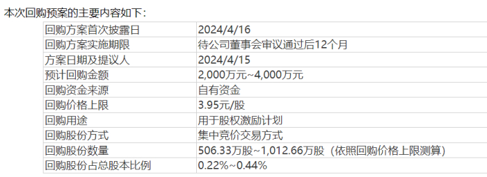 2024年4月,红豆股份宣布,拟回购公司部分社会公众股份,回购股份资金总额不低于2000万元(含)且不超过4000万元(含),回购股份的价格不超过3.95元/股(含)。