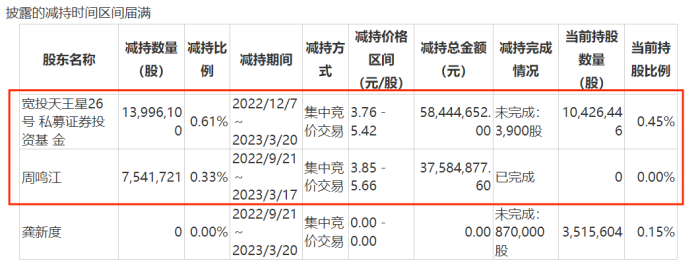 2022年9月至2023年3月,周鸣江将所持有的0.33%股份全部减持,套现3758.49万元离场。