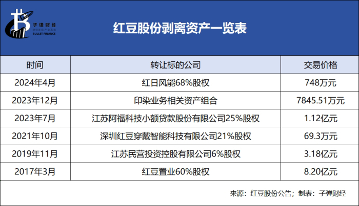 于是,红豆股份又开始陆续“甩包袱”,重新聚焦男装业务。据‘子弹财经’不完全统计,2017年至2024年期间,公司先后剥离了房地产、印染、新能源、小额贷款等一众业务。