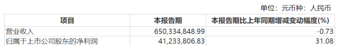 2024年一季度,公司实现营收6.50亿元,同比下滑0.73%;归母净利润4123.38万元,同比增长31.08%。