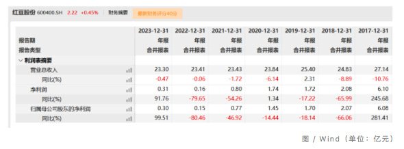 Wind数据显示,自2001年上市至2023年的23年时间里,红豆股份仅有8年时间交出了营收、净利润双增长的成绩单,其余时间就在业绩下滑里徘徊。