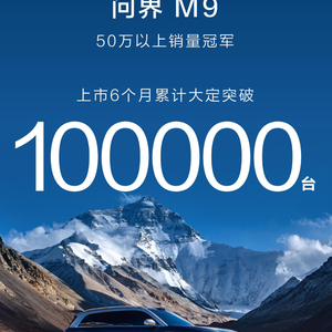 问界M9上市6个月累计大定破10万辆,连续9周获50万以上车型销量第一